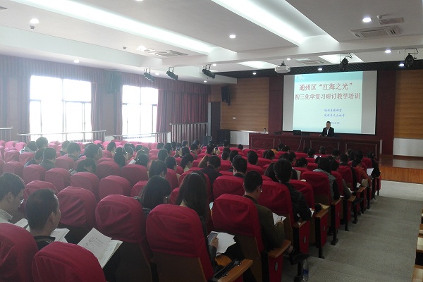4月15日,通州区教研室在文山初中举行了2016年通州区“江海之光”初三化学复习研讨培训会。区教研室老主任崔凤鸣主持了会议,全区所有初三化学老师共100多人参加了培训。本次培训进行了技术创新:参会老师不再进教室观摩老师上课,而是在大会议室观看了文山初中和育才中学两位老师的课堂录像;听取了两位授课老师的教学思路介绍和两位教学骨干的点评。下午崔主任就2016年初三化学中考复习提出来相应的要求并进行了相关辅导。(徐宜华)