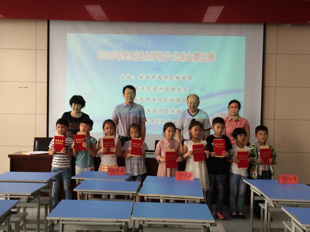 6月29日,区教育局、财政局在实验小学联合举办2016年试点学校少儿珠心算比赛,实验小学、石港小学、金沙小学、刘桥小学、张芝山小学的95名珠心算小选手参加了一、二、三年级组的角逐,经过三个多小时的激烈竞争,金沙小学、石港小学、实验小学分获一、二、三年级组团体一等奖,施语欣、邢于飞、王珏分获一、二、三年级组个人全能一等奖,谢永华、时美丽、葛苏琴获得教练奖一等奖。